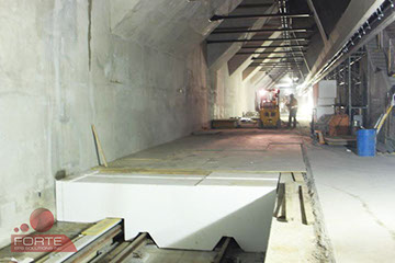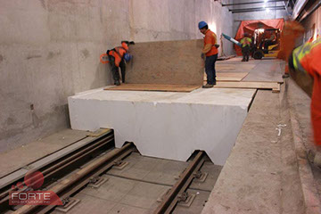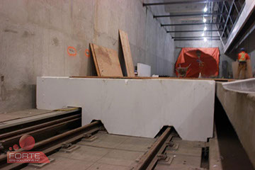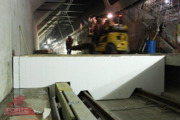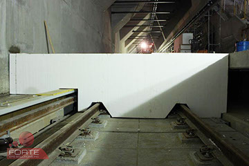 The ideal solution was designed and fabricated quickly by Forte EPS Solutions – by custom cutting 40 psi expanded polystyrene panels 13 ft wide to fit over the rails, electrical and other track obstructions. This solution enabled a rapid assembly and removal of a flat platform over an uneven base , assuring the integrity of the tracks and equipment, whilst allowing the additional work required to the station.